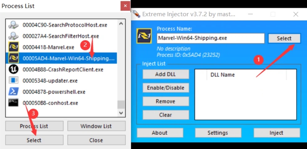 2.运行游戏,以管理员方式运行注入器“Extreme Injector.exe”,选择游戏进程为Marvel-Win64-Shipping.exe,如下图: