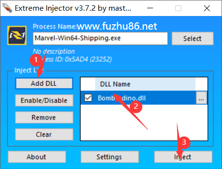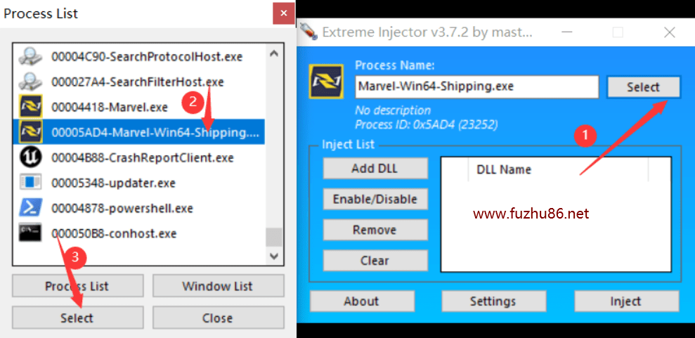 2.运行游戏,以管理员方式运行注入器“Extreme Injector.exe”,选择游戏进程为Marvel-Win64-Shipping.exe,如下图: