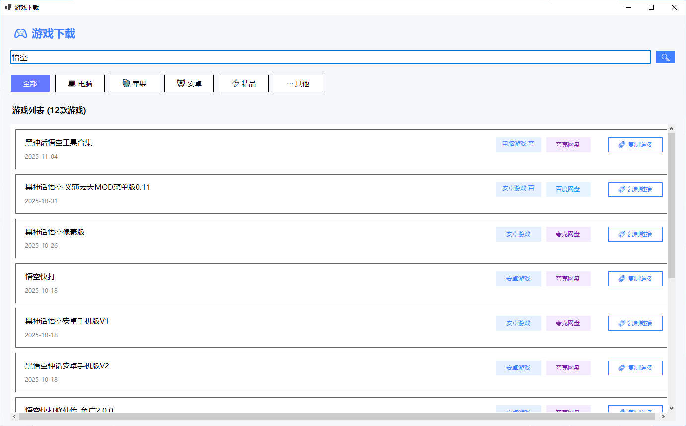 游戏下载器是一款由大佬精心制作的绿色版软件,专门用于搜索电脑游戏和手机游戏。用户无需进行复杂的安装步骤,只需双击打开即可使用。该工具拥有极为简洁的用户界面,仅包含一个搜索框,用户可以直接输入关键词来查找所需的游戏资源。虽然软件本身不提供直接下载功能,但它会给出相关的网盘链接,用户可以轻松复制这些链接并在浏览器中下载心仪的游戏。